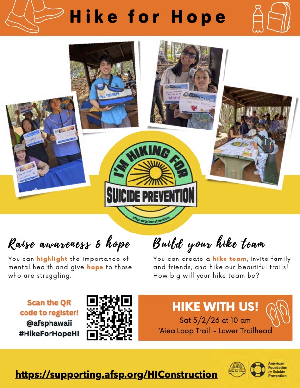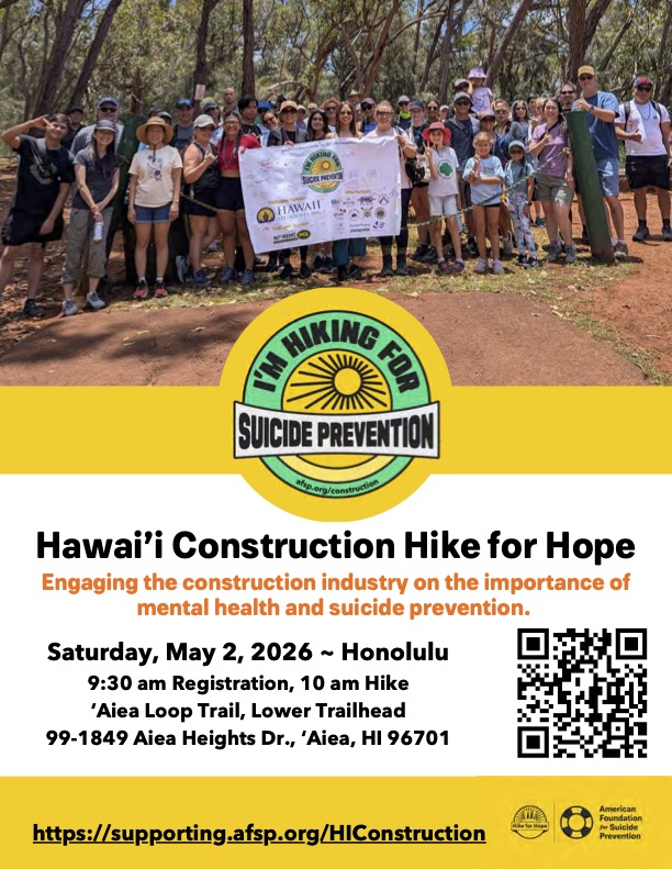This May, The American Foundation for Suicide Prevention (AFSP), Hawaii Chapter, is promoting hiking and exercise, self-care, enjoying nature, and building community with their virtual *Construction* Hike for Hope. Everyone can participate in hikes anywhere, anytime, all month long. AFSP has a special focus on construction workers, who have the highest rates of suicide among the professions in the US.