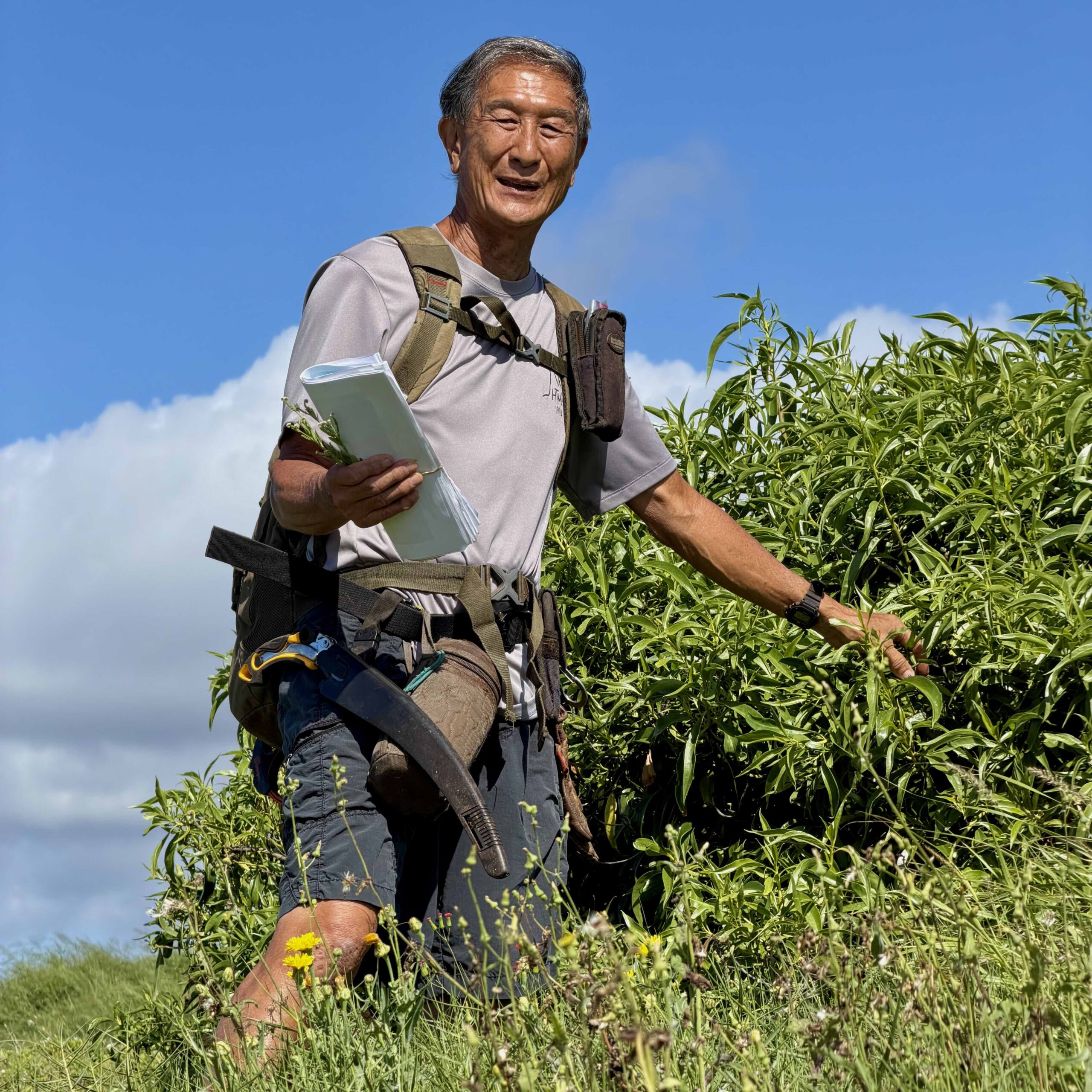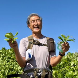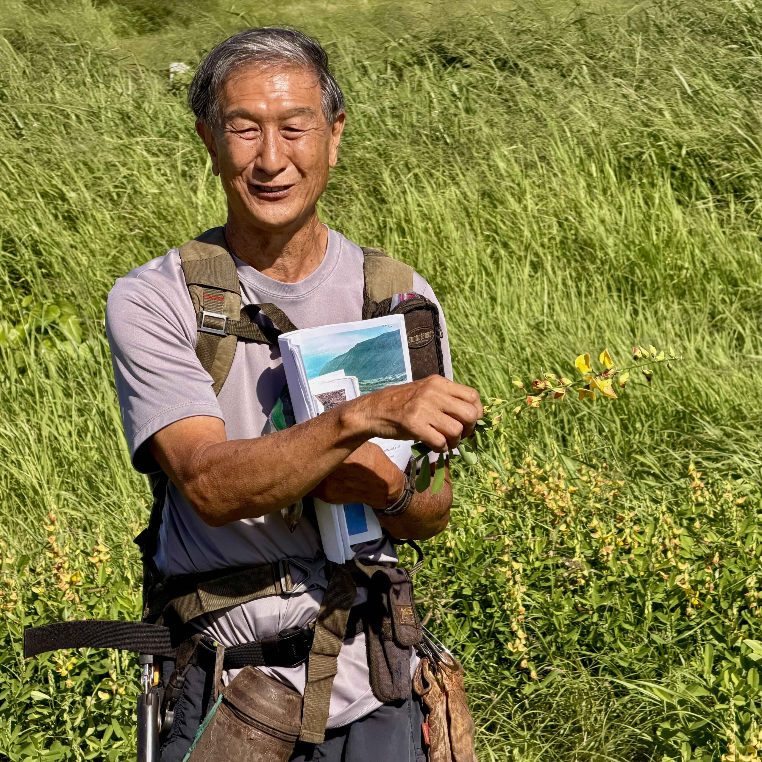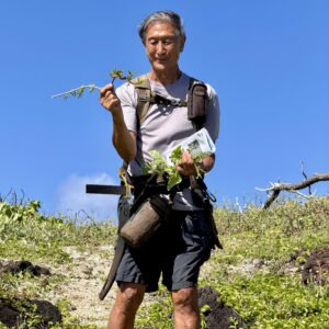 Kenji holding new invasive wildflower and naupaka kahakai and kuahiwi (collected prior)