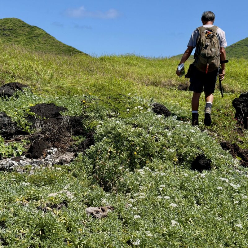 Kenji’s botanical education came through years of trail clearing with HTMC alongside his mentor, Kost Pankiwskyj. Each Sunday, Kenji made it his goal to learn one new plant; Kost would quiz him on it at the end of the day. That discipline shows. Kenji now makes, prints, and freely shares a variety of detailed booklets of the plants found in select areas of O’ahu — including the recently updated one that he handed out on this hike: Plants Found on the Kaiwi Coastline. Filled with photographs and descriptions, the booklets are living documents he continually updates as local groups add more native plantings to the area.