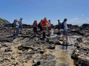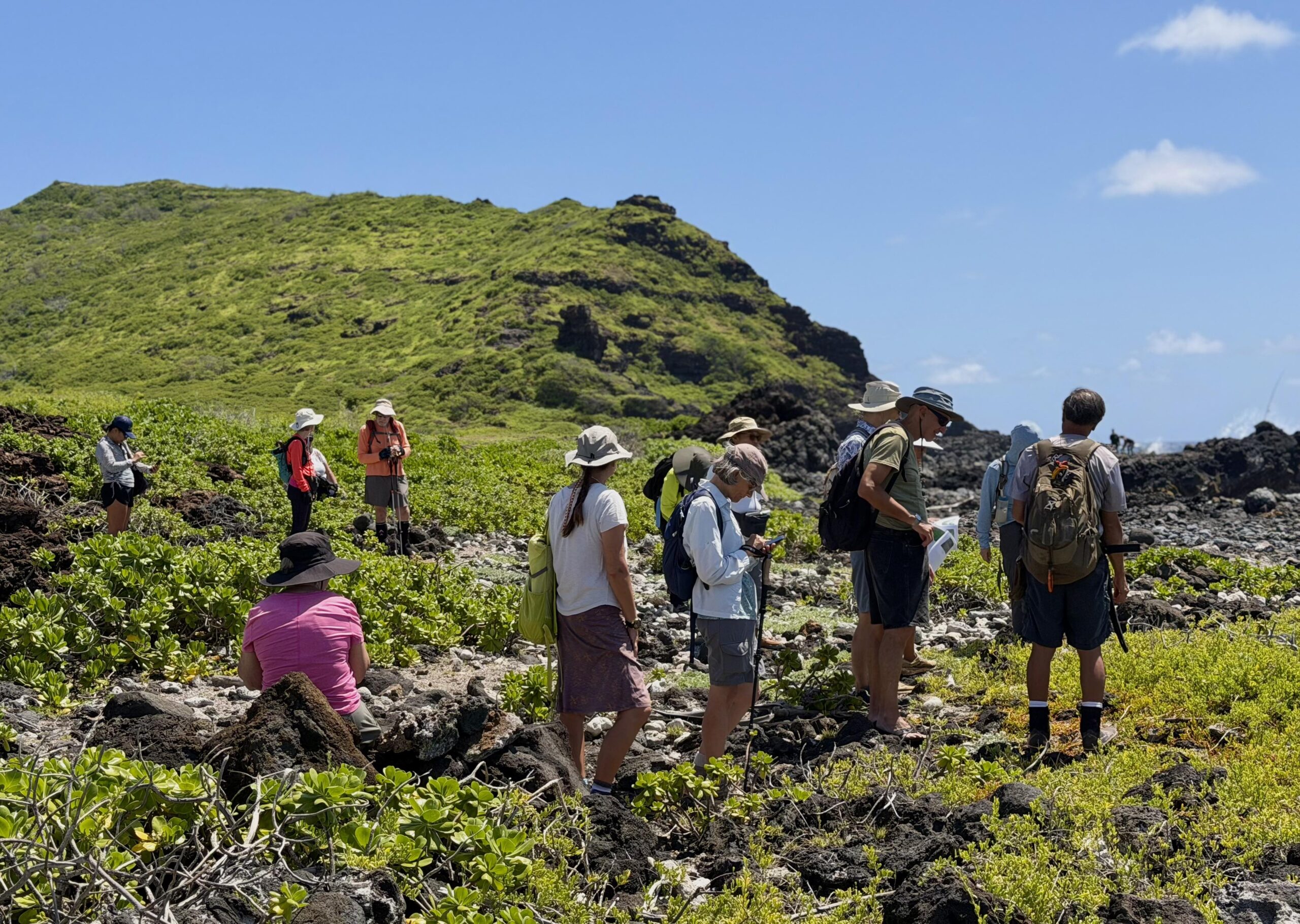 Slowly our group made its way to the rocky outcropping called Kapaliokamoa — Pele’s Chair — pausing along the way to examine and discuss the plants. On a cliff above the crashing waves Kenji went off to find and then share his pohaku – an amazing rock with a face carved into it that he spotted years ago while fishing. As the sun climbed and the temperature rose, we eventually wound our way back to the cars, where Kenji had cold drinks and snacks waiting for the group.